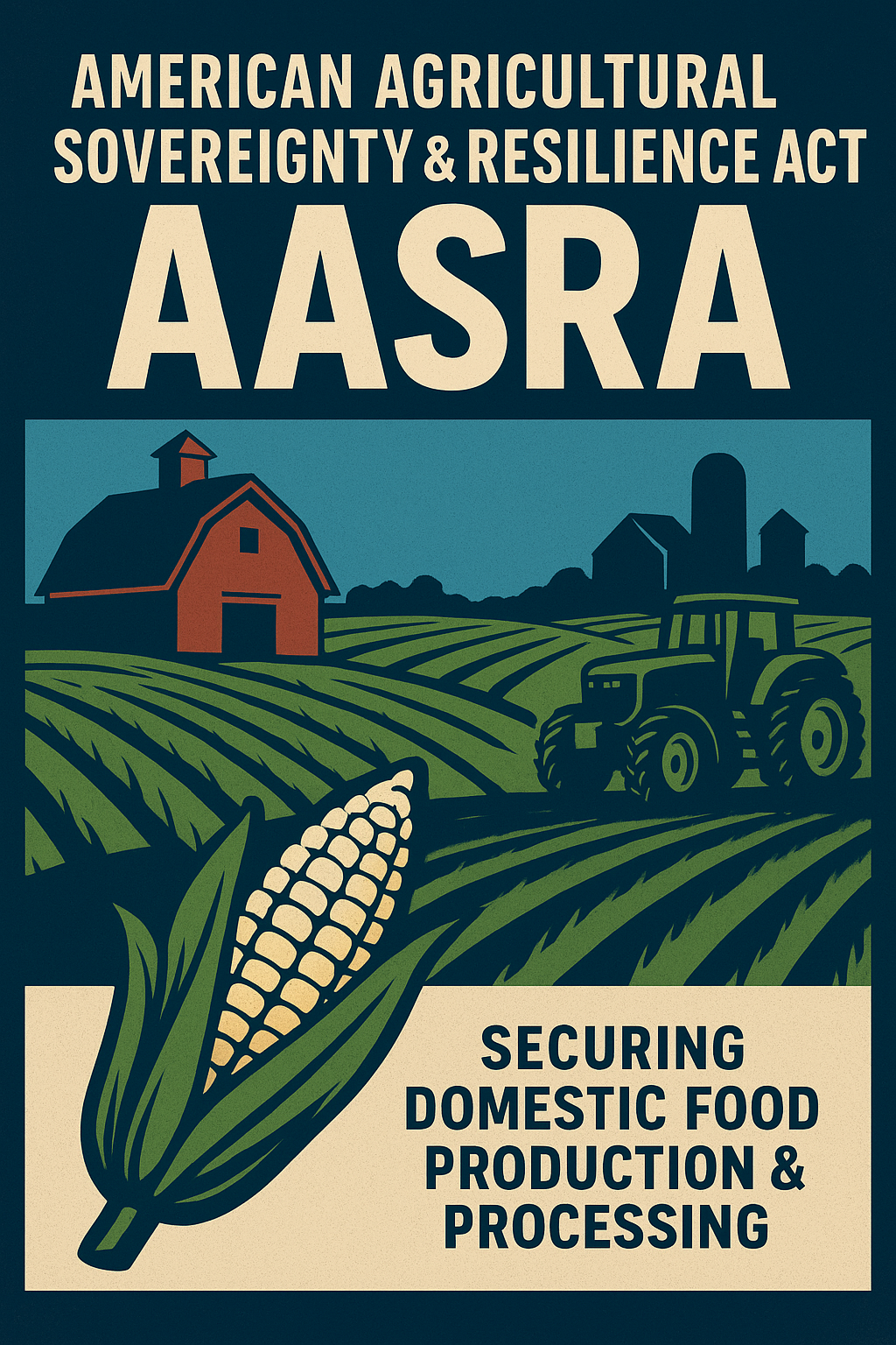 The American Agricultural Sovereignty & Resilience Act (AASRA) establishes a federal–state integrated framework that secures domestic food production and processing through direct producer-to-processor pipelines, adaptive surplus stabilization, and priority infrastructure deployment. By linking farmers, certified processors, and strategic reserves with real-time market intelligence, parity pricing, and logistics coordination, the system ensures resilient supply chains, price stability, and national food security, capable of absorbing export shocks, natural disruptions, or geopolitical pressures while strengthening rural economies and reinforcing sovereign control over critical agricultural resources.